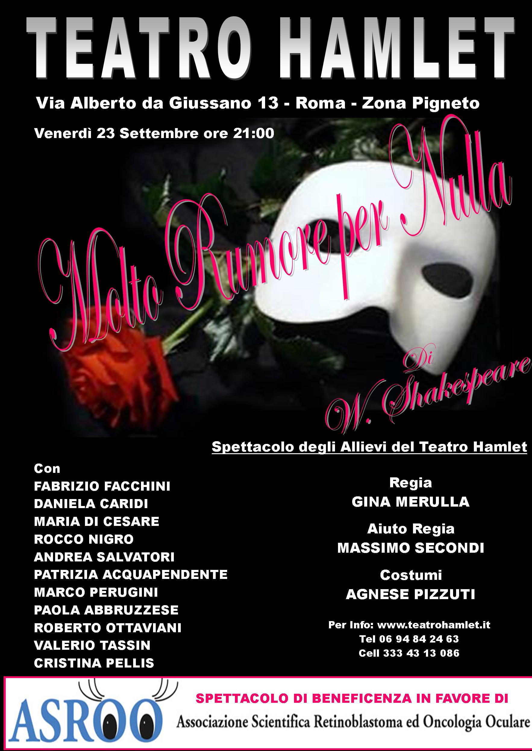 Si svolge venerdì 23 settembre alle ore 21 lo spettacolo di beneficenza a favore di ASROO. “Molto rumore per nulla” di William Shakespeare è la commedia che verrà rappresentata dagli allievi del Teatro Hamlet di Roma. Una grande occasione per chi vuole donare in beneficenza per la ricerca su patologie oculari e il retinoblastoma. Lo spettacolo vede la regia di Gina Merulla e aiuto regia Massimo Secondi; i costumi sono di Agnese Pizzuti. È possibile acquistare il biglietto, al costo di 10 euro, direttamente la sera dello spettacolo.
